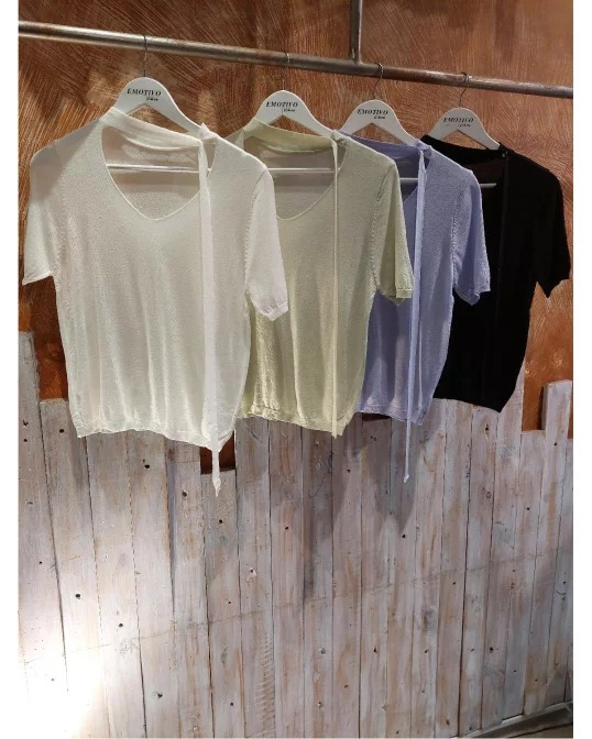 REMERA ESCOTE V CON LAZO Y BOTON DE PERLA